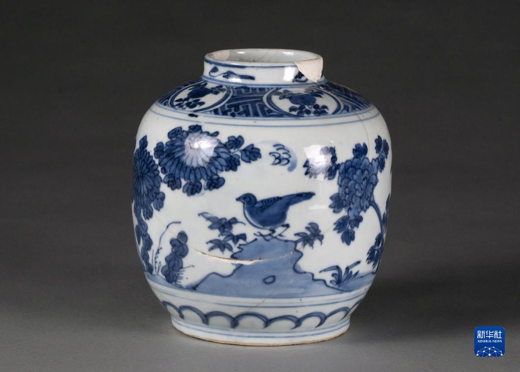 河南开封州桥及附近汴河遗址出土的明晚期景德镇窑青花花卉纹罐(资料照片)。