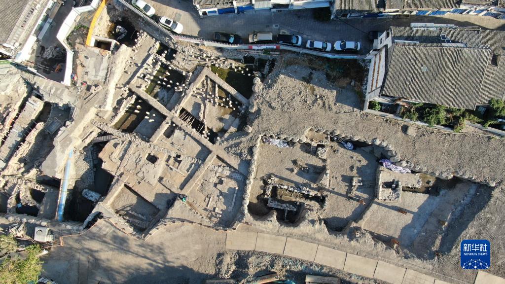 俯瞰浙江温州朔门古港遗址发掘出的古码头遗址(2022年10月10日摄,无人机照片)。