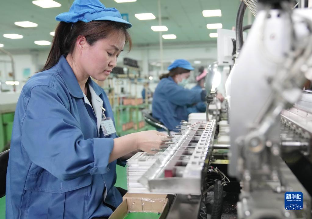 4月9日,工人在河北省青龙满族自治县青龙镇逃军山村一家电子产品企业的生产车间工作。
