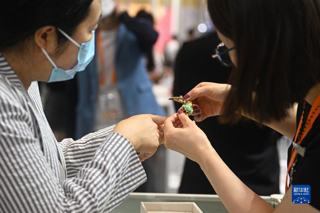 4月11日,在消博会意大利企业馆,工作人员(右)向观众介绍来自意大利的珠宝产品。