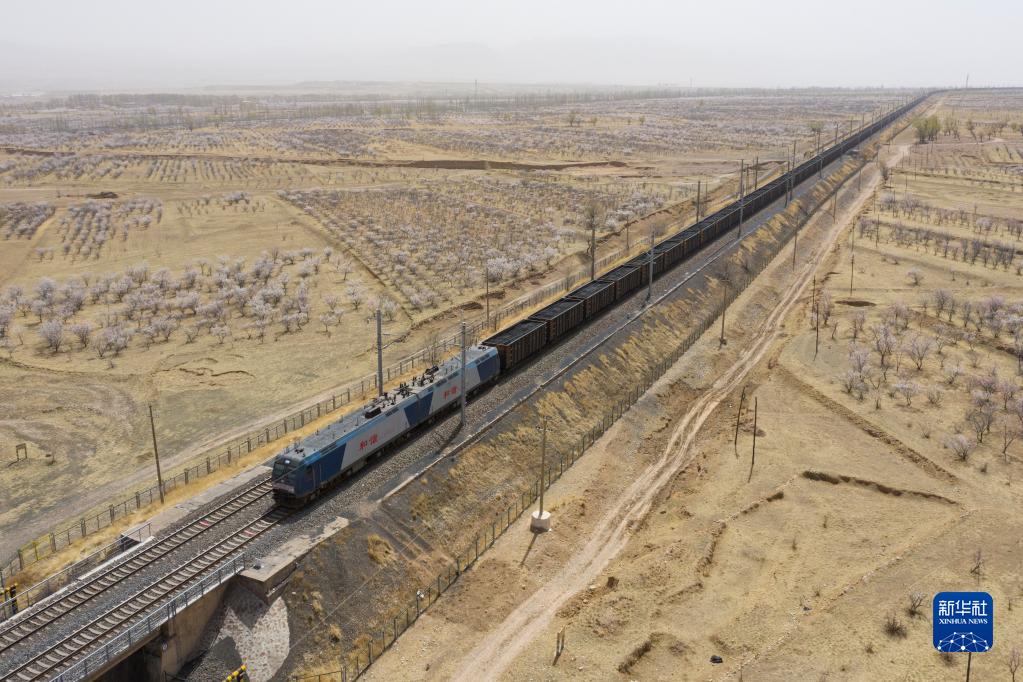 重载列车行驶在大秦铁路上(4月11日摄,无人机照片)。
