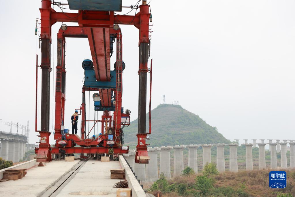 4月12日,工作人员在尖坡寨特大桥进行预制梁架设施工。