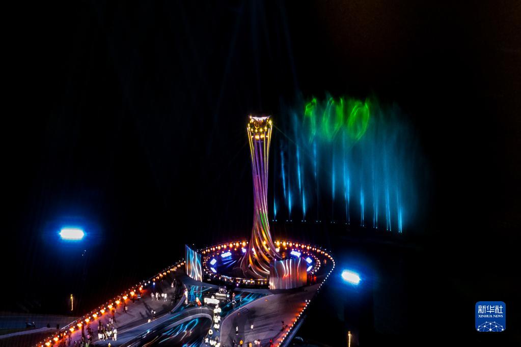 这是4月19日拍摄的第31届世界大学生夏季运动会主火炬以及映在水幕上的“100”字样(无人机照片)。