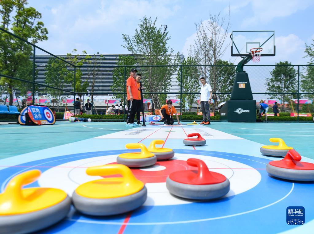 4月19日,在成都东安湖体育公园,体育爱好者在 “潮流运动会”上体验陆地冰壶。