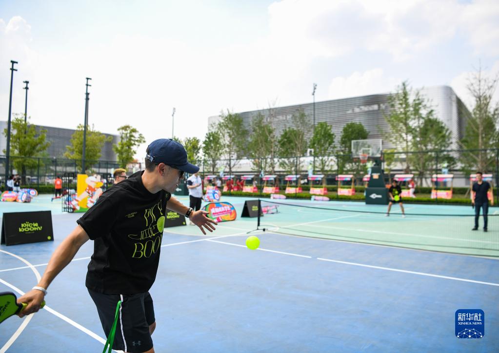 4月19日,在成都东安湖体育公园,体育爱好者在 “潮流运动会”上打匹克球。