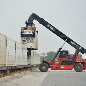 4月16日,在泰国东部兰乍邦火车货运站,吊车将载有榴莲的集装箱货柜转运到列车上。新华社发(拉亨摄)