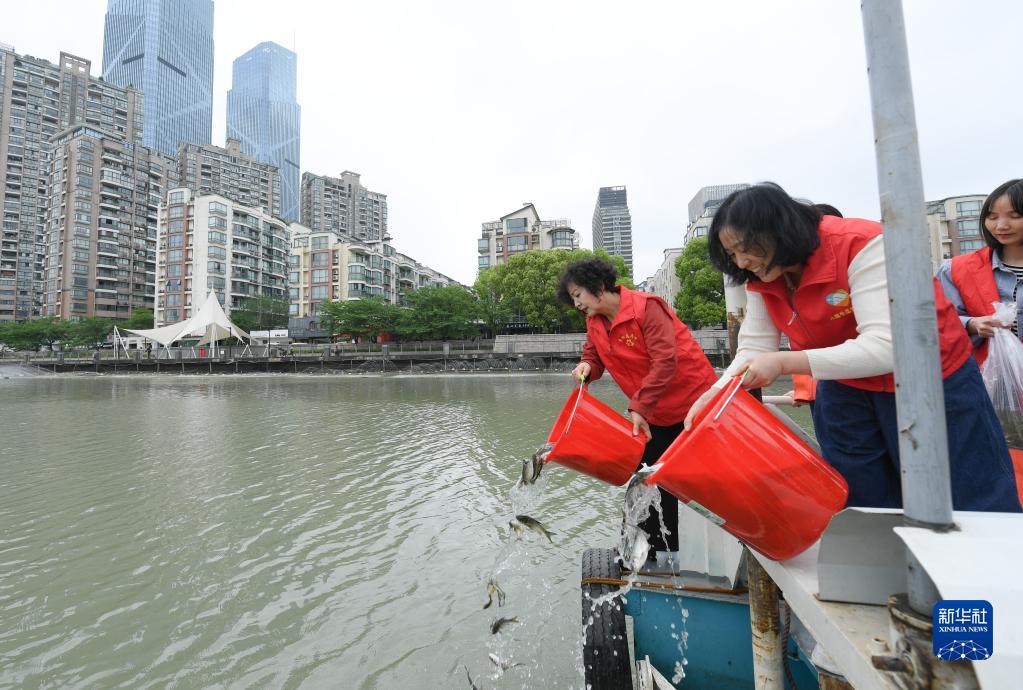 4月20日,湖州市爱山街道的志愿者在河道投放鱼苗。
