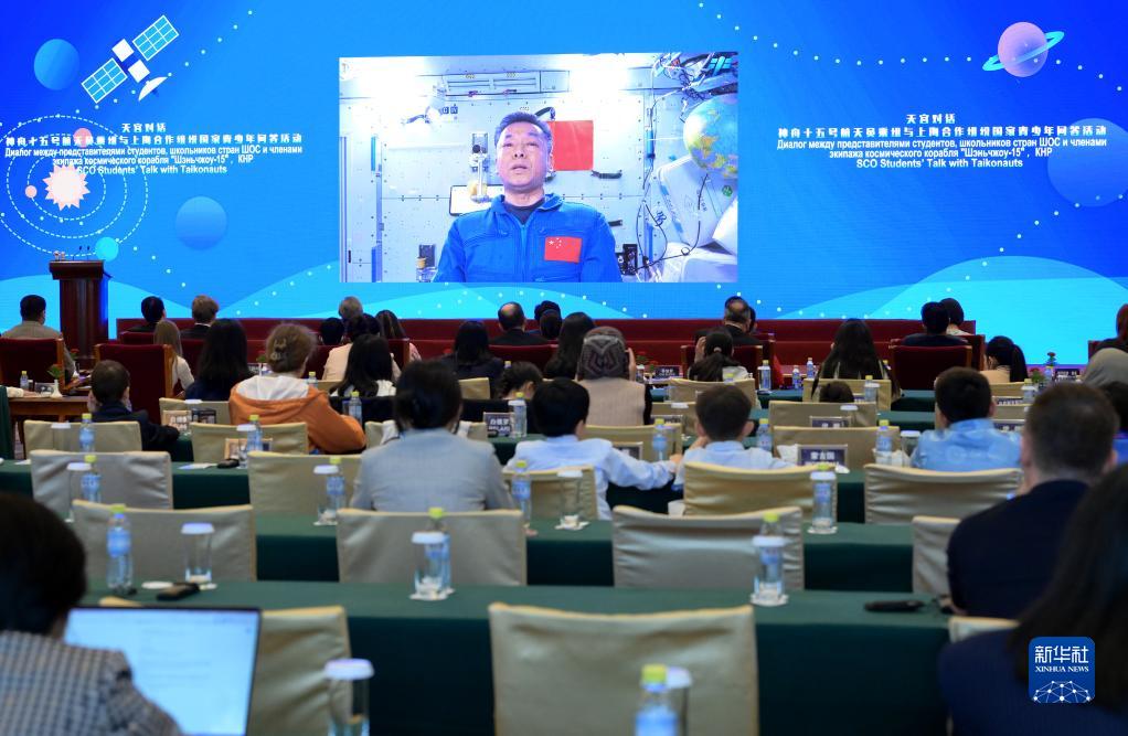 4月20日,神舟十五号航天员通过视频屏幕回答上海合作组织国家青少年的提问。新华社记者 李贺 摄