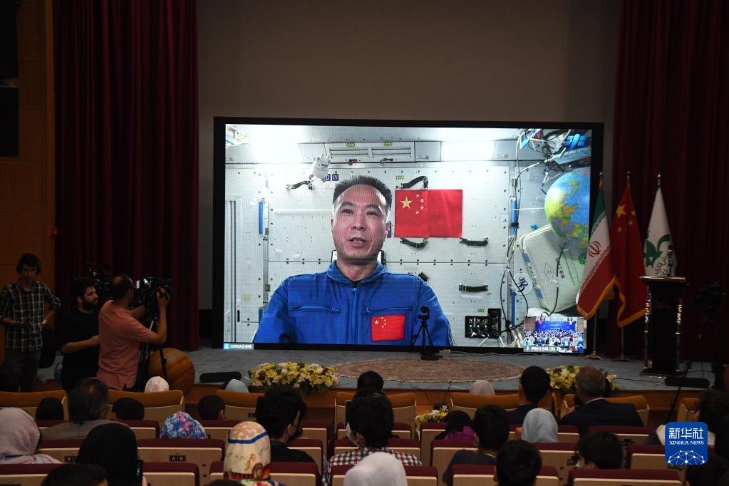 这是4月20日在伊朗首都德黑兰青少年智育中心礼堂拍摄的天宫对话——神舟十五号航天员乘组与上海合作组织国家青少年问答活动的伊朗会场现场。新华社记者 沙达提 摄