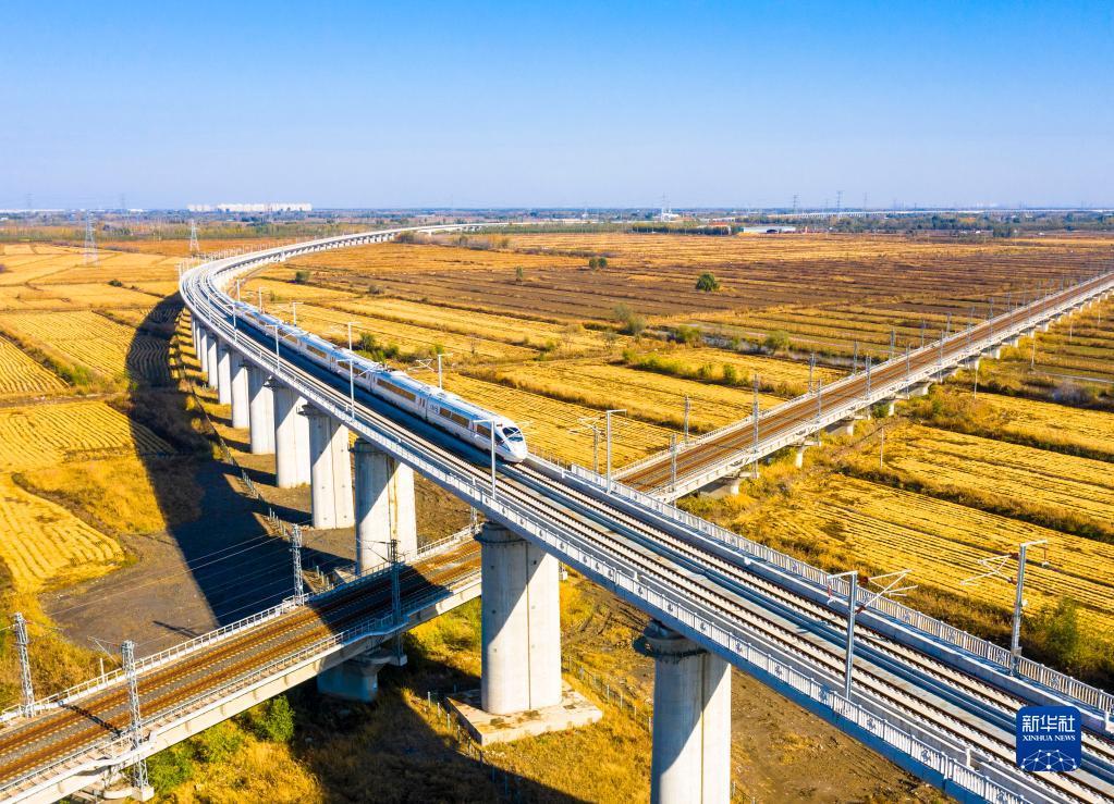 这是在天津北辰区拍摄的动车组列车行驶在京滨城际铁路宝坻至北辰段(2022年11月4日摄,无人机照片)。
