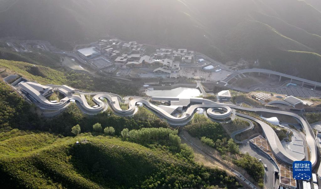这是在北京市延庆区拍摄的国家雪车雪橇中心和冬奥村(2022年4月26日摄,无人机照片)。