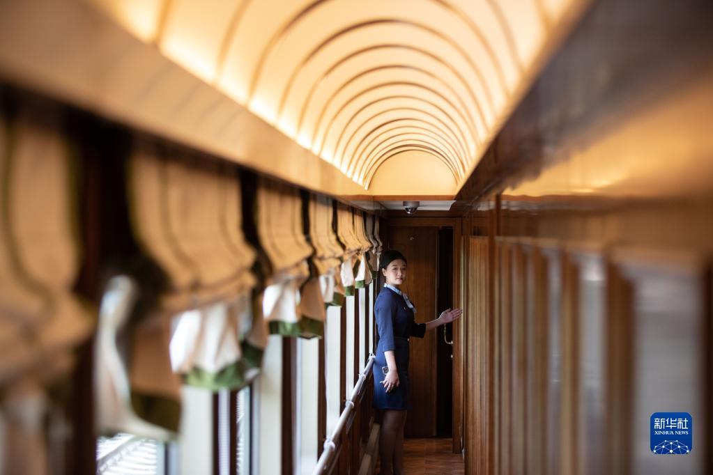 6月18日,乘务员在“林都号”旅游列车车厢工作。