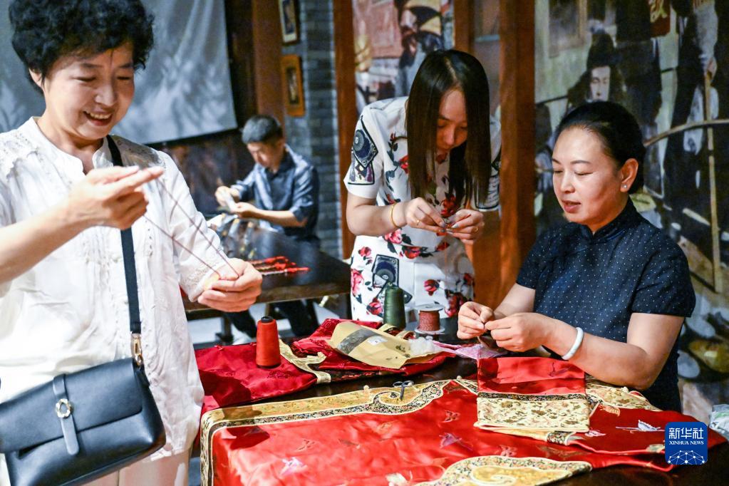 陈玉秋(右一)在吉林市博物馆教人们制作端午节香囊(6月19日摄)。