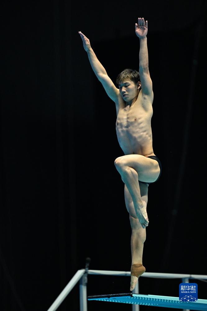 7月18日,中国选手郑九源在三米板项目比赛中。