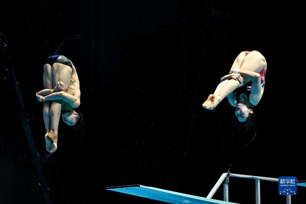 7月18日,中国选手司雅杰(右)/白钰鸣在混双三米板比赛中。