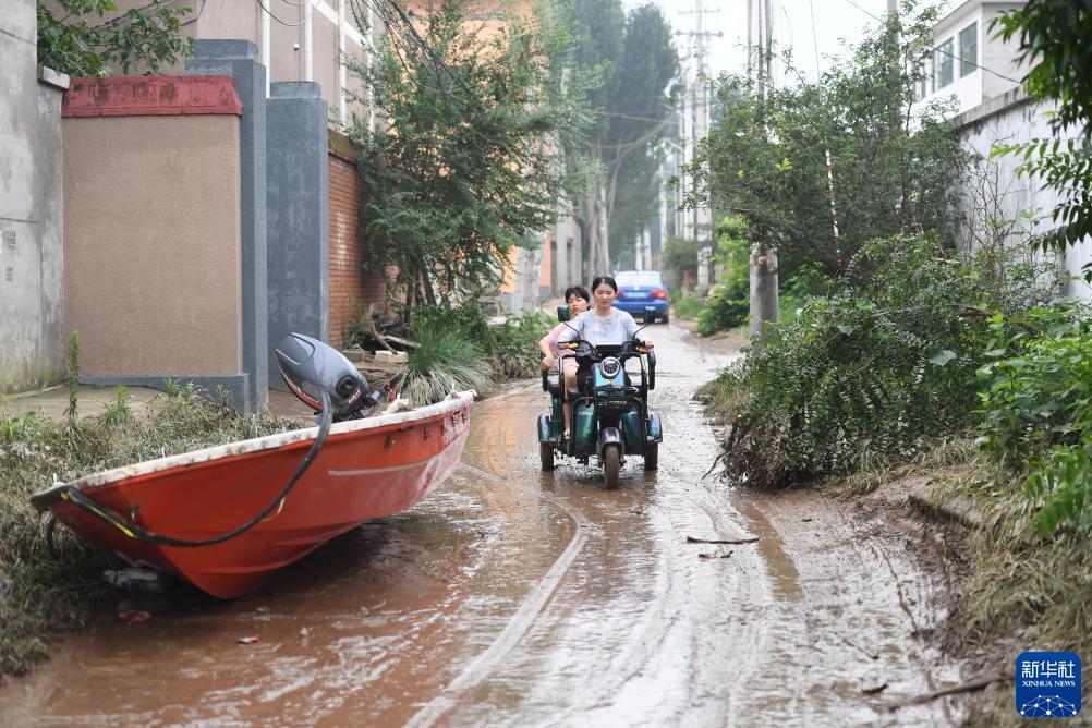 8月3日,涿州市码头镇北高家庄村居民在街道上骑行。