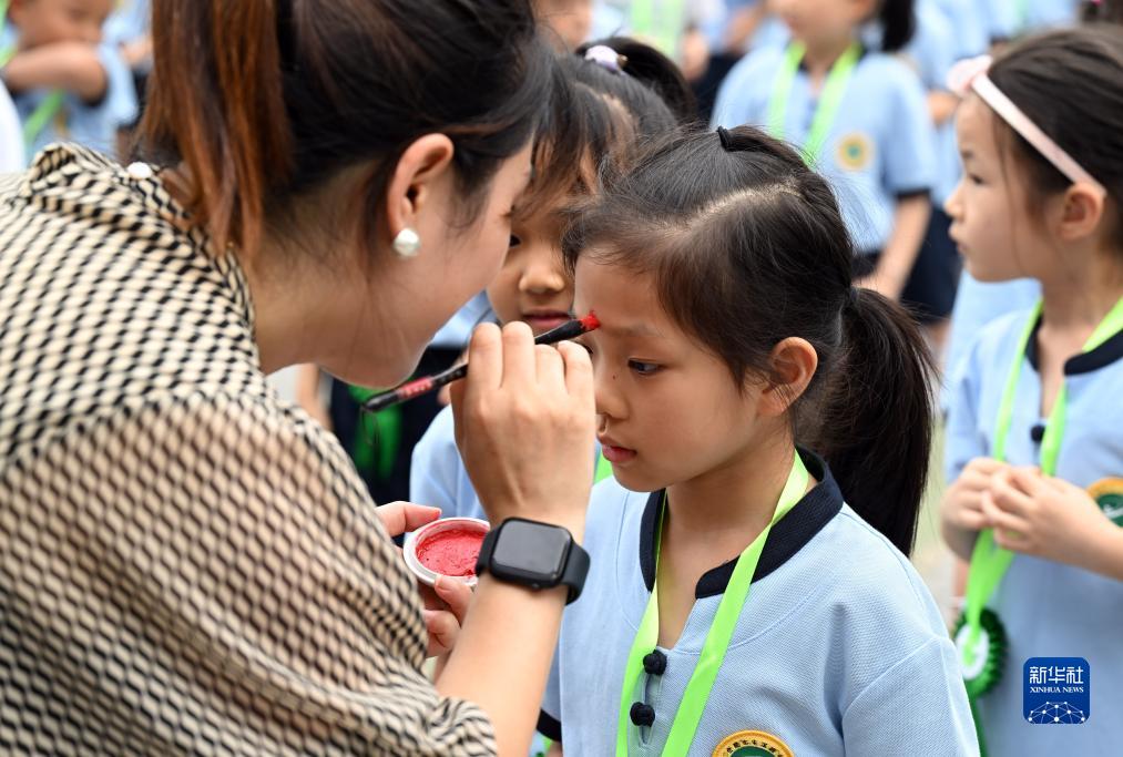8月30日,在安徽省合肥市屯溪路小学,老师为一年级新生点朱砂启智,让孩子体验传统文化,迎接新学期。