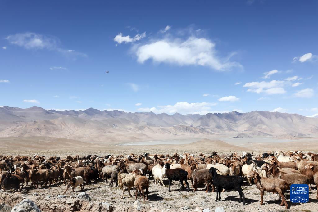 在“冰川之父”慕士塔格峰脚下,新疆塔什库尔干塔吉克自治县塔合曼乡境内的一片天然草场吸引周边乡村的牧羊人在此放牧。进入秋季以来,草场渐渐泛黄,屹立于远处的慕士塔格峰和公格尔九别峰在蓝天白云的映衬下格外壮美,一幅宁静悠远的牧羊图引人入胜。
