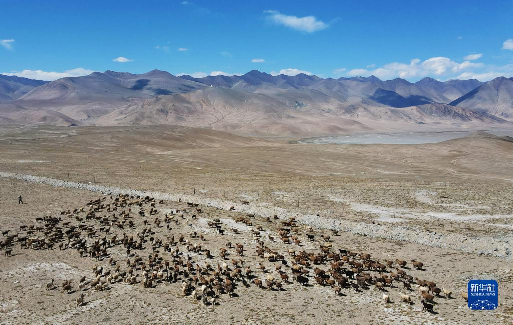 在位于塔合曼乡境内的一片天然草场上,一群羊在低头吃草(无人机照片,9月6日摄)。