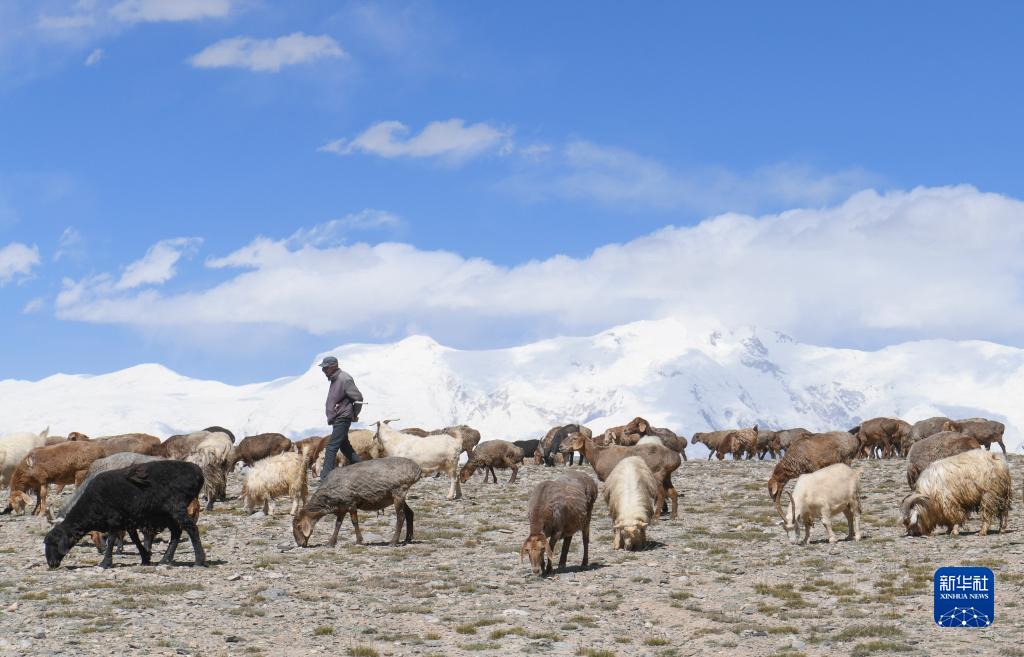 在“冰川之父”慕士塔格峰脚下,新疆塔什库尔干塔吉克自治县塔合曼乡境内的一片天然草场吸引周边乡村的牧羊人在此放牧。进入秋季以来,草场渐渐泛黄,屹立于远处的慕士塔格峰和公格尔九别峰在蓝天白云的映衬下格外壮美,一幅宁静悠远的牧羊图引人入胜。