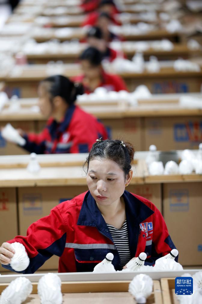 10月7日,工人在贵州省锦屏经济开发区贵州亚狮龙体育文化产业发展有限公司羽毛球生产基地工作。