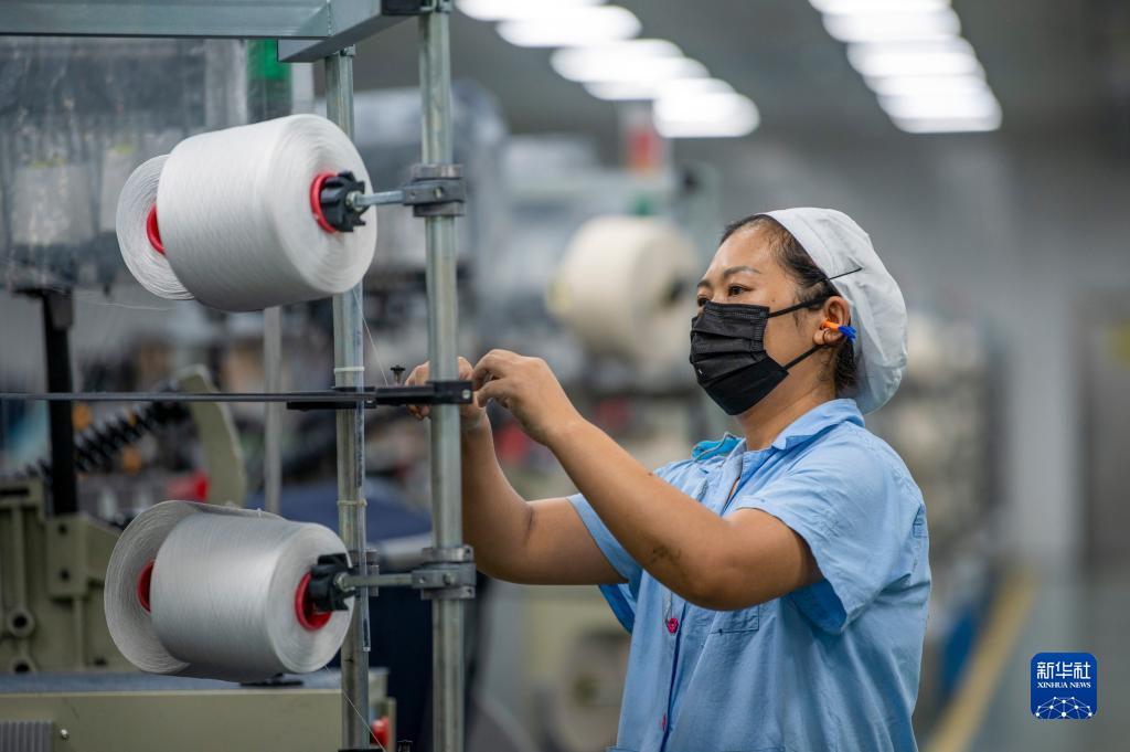 10月7日,工人在位于浙江省兰溪市的浙江金梭纺织有限公司牛仔面料自动化生产线旁巡检。