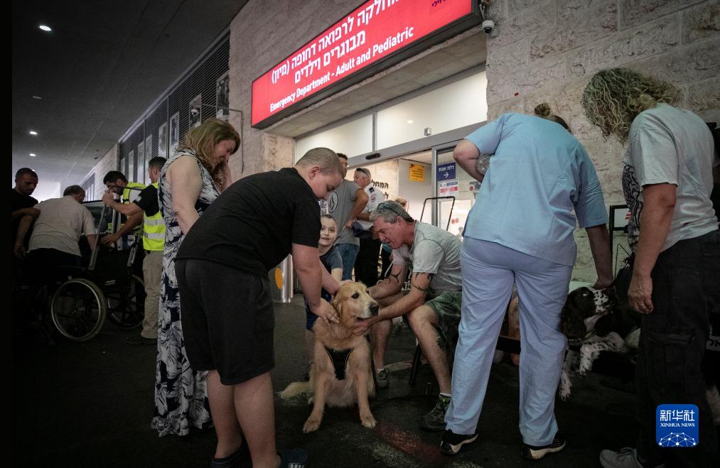 10月9日,在以色列南部城市阿什凯隆一家大型医院,经过训练的心理治疗犬正在给民众提供服务。