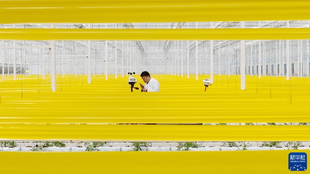 在浙江省湖州市德清县阜溪街道龙胜村水木“未来农场”,技术人员观察番茄智能大棚光照数据(2023年4月7日摄,无人机照片)。