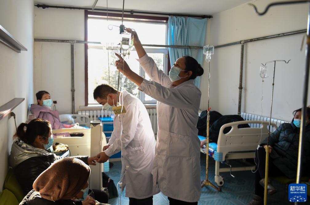 在内蒙古锡林郭勒盟西乌珠穆沁旗的巴彦高勒卫生院,院长姚春明和妻子陈丽华为前来就诊的牧民输液(2023年1月7日摄)。他们在这里已经工作了20个年头。
