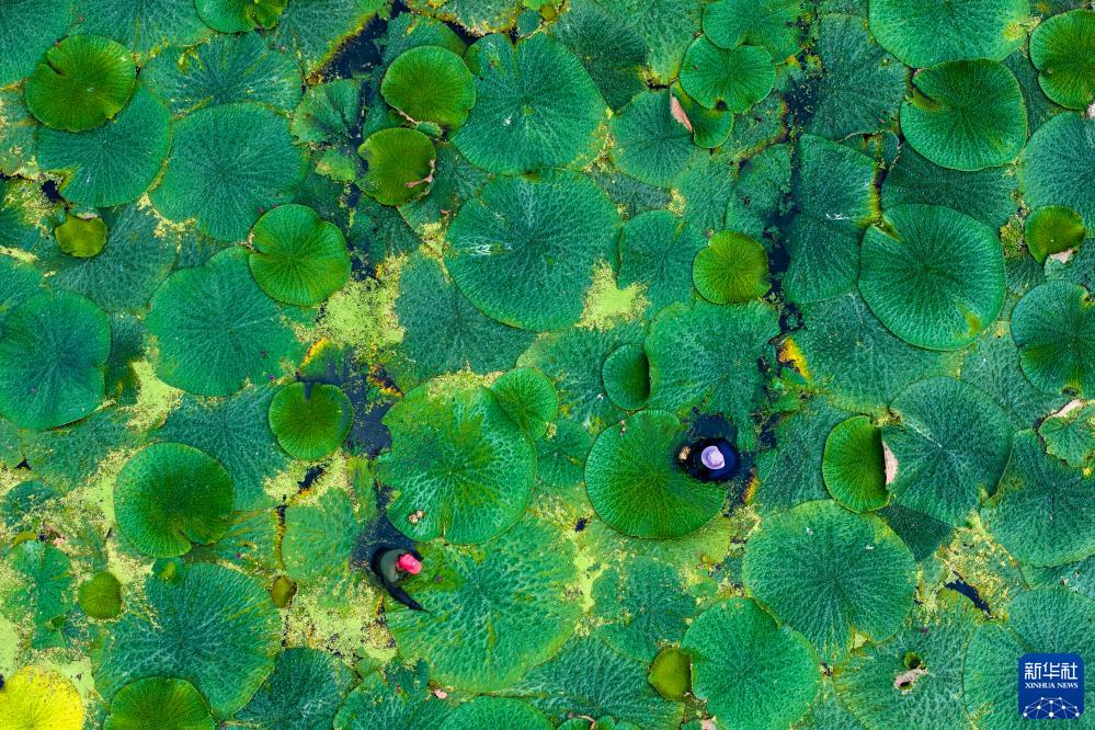 江苏省泰州市姜堰区顾高镇申俞村农民在采收芡实(2023年8月21日摄,无人机照片)。