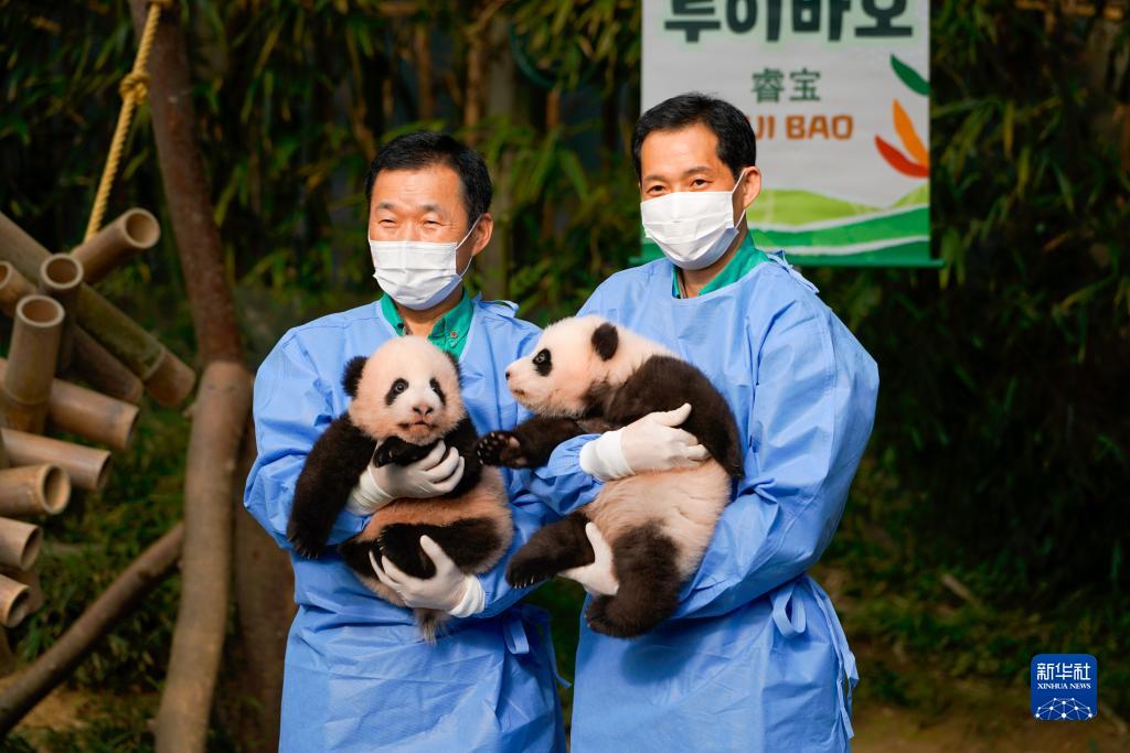 当日,旅韩大熊猫“爱宝”、“乐宝”的双胞胎幼崽首次与公众见面。双胞胎幼崽的名字“睿宝”、“辉宝”也同时公布。