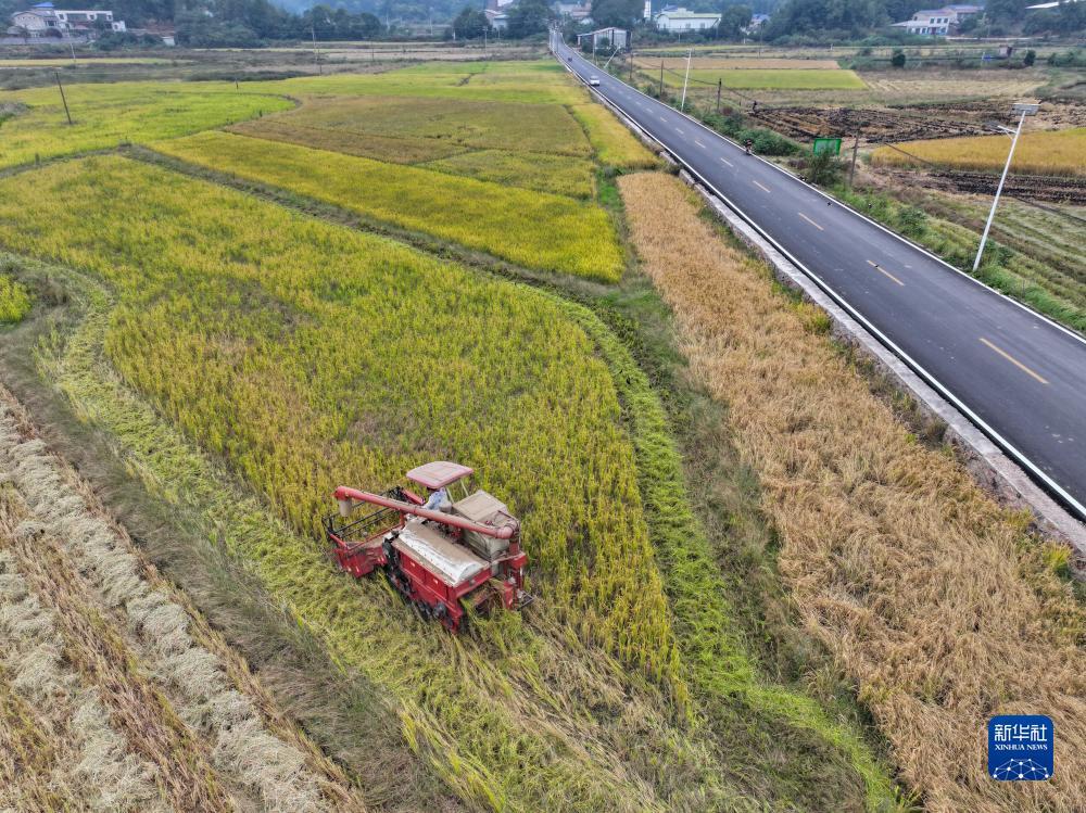 10月19日,在湖南省湘潭市雨湖区鹤岭镇晶鑫村,农户驾驶农机在农田里收割水稻(无人机照片)。