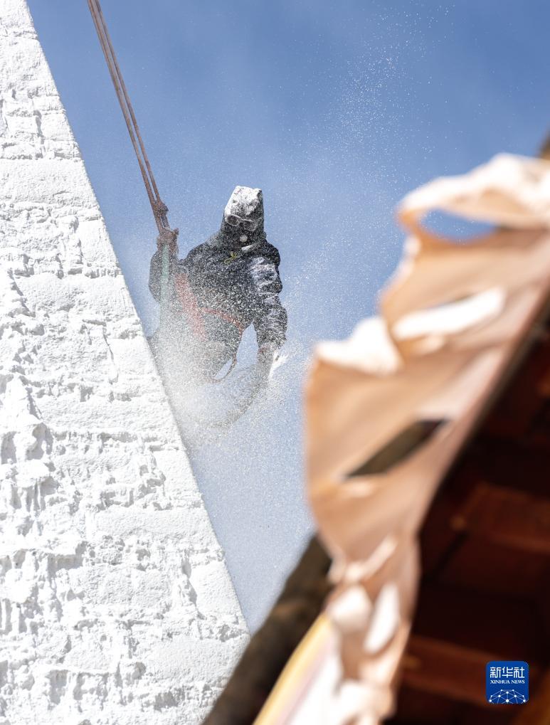 工作人员对布达拉宫外墙喷洒涂料(10月18日摄)。