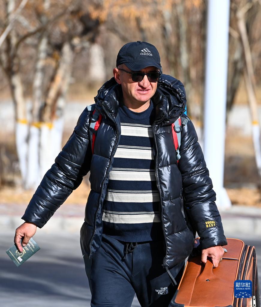 出境旅客携带行李和护照前往新疆红其拉甫口岸联检大厅(11月6日摄)。