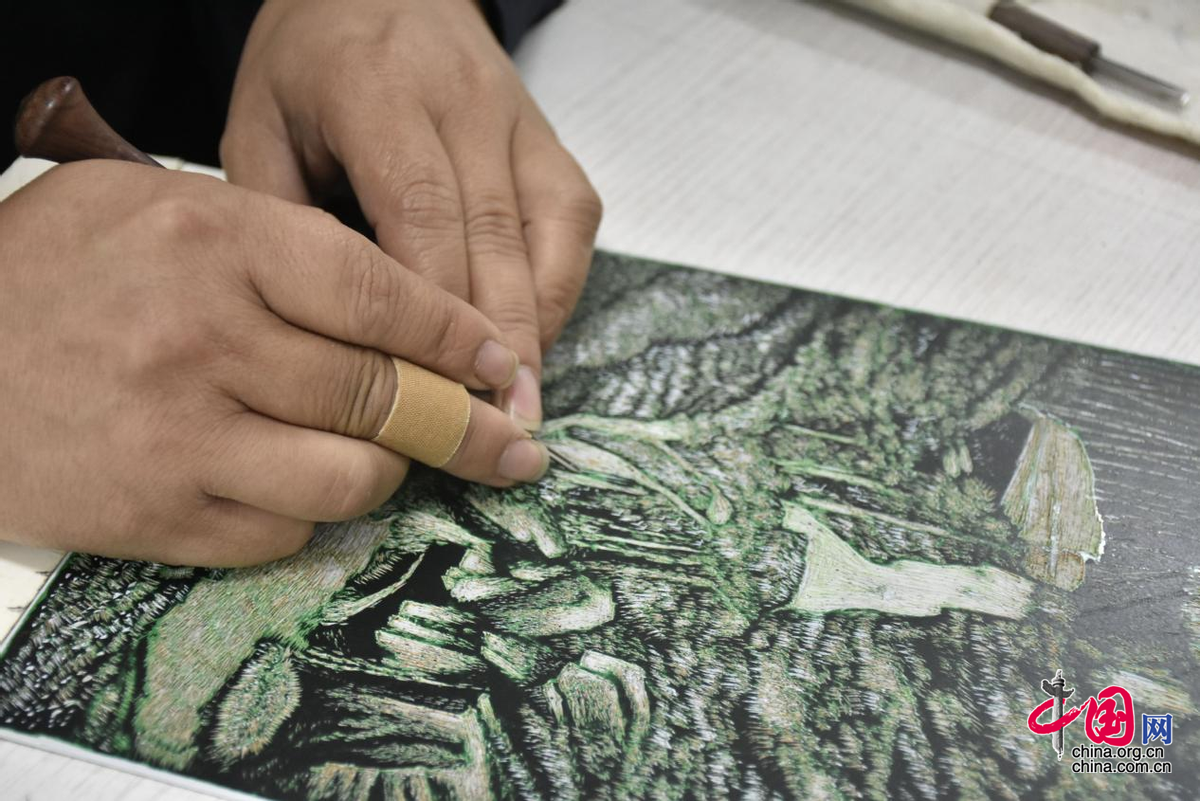图:学生正在创作版画。姜颖/摄