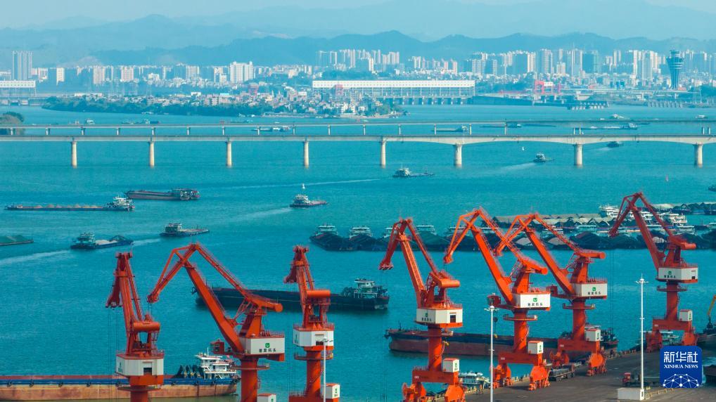 1月3日,在广西梧州临港经济区赤水港码头,工人操作设备在码头上进行装卸作业(无人机照片)。