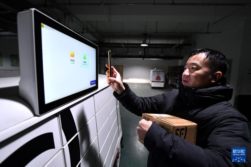 1月22日,无人驾驶配送车在小区停泊点等待居民取邮件。