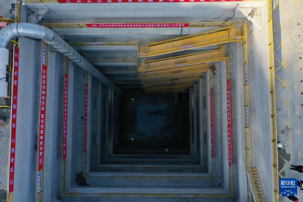 1月23日在宁波市北仑区拍摄的甬舟铁路金塘海底隧道宁波侧盾构工作井(无人机照片)。据了解,盾构工作井是盾构隧道工程中的重要设施之一,既是后续盾构机零部件进场组装的吊装通道,又是盾构机掘进施工期的物料运输通道。本次建成的宁波侧盾构工作井长22.6米,宽21.1米,深58.13米,由地下9层结构组成。