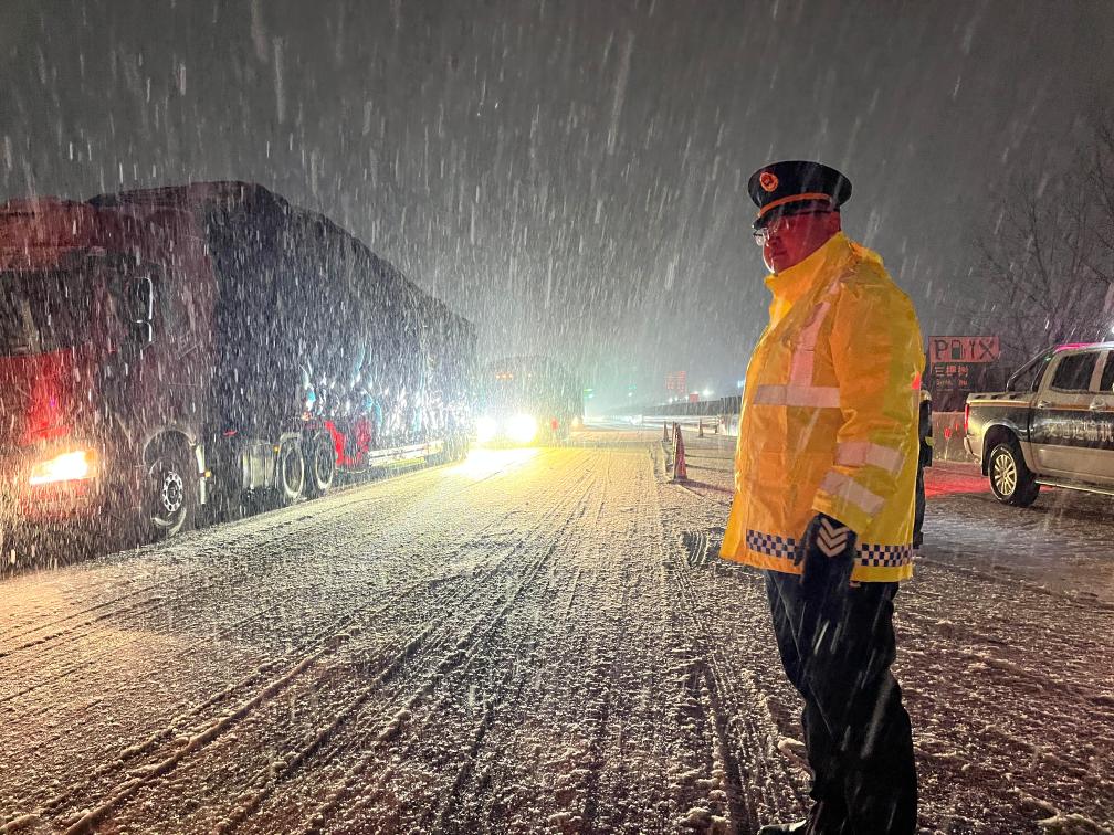 1月22日晚,执勤交警在长陔岭对通行车辆进行劝导和安全提示。(安徽省黄山市歙县公安局交通管理大队王村中队供图)