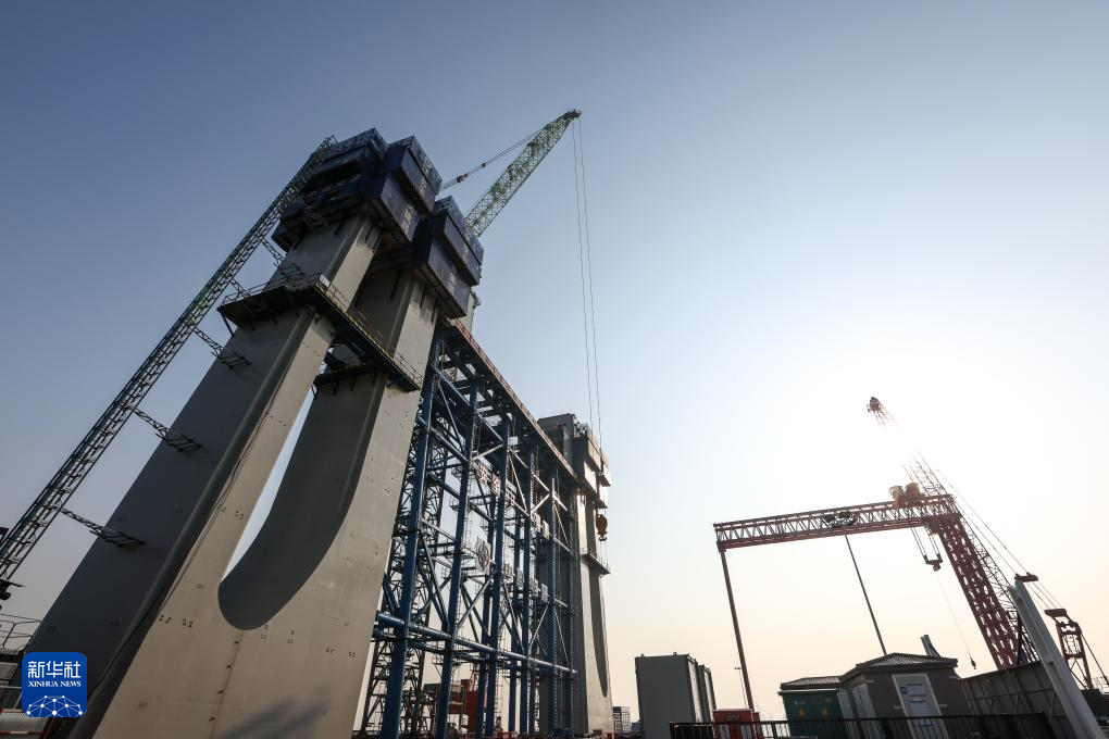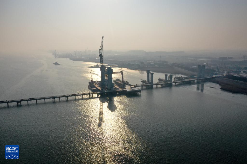 冬日里,在江苏张靖皋长江大桥建设工地上,工人们正冒着寒风有序施工。张靖皋长江大桥连接江苏苏州、泰州和南通三市,跨江段全长7859米,于2022年开工建设。