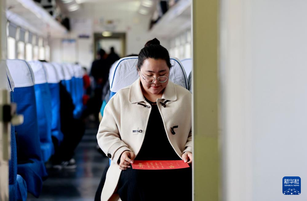 苏媛婷手持婚书坐在杜永其值乘的K4081次列车车厢中(2月1日摄)。