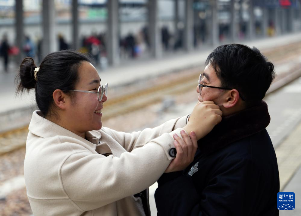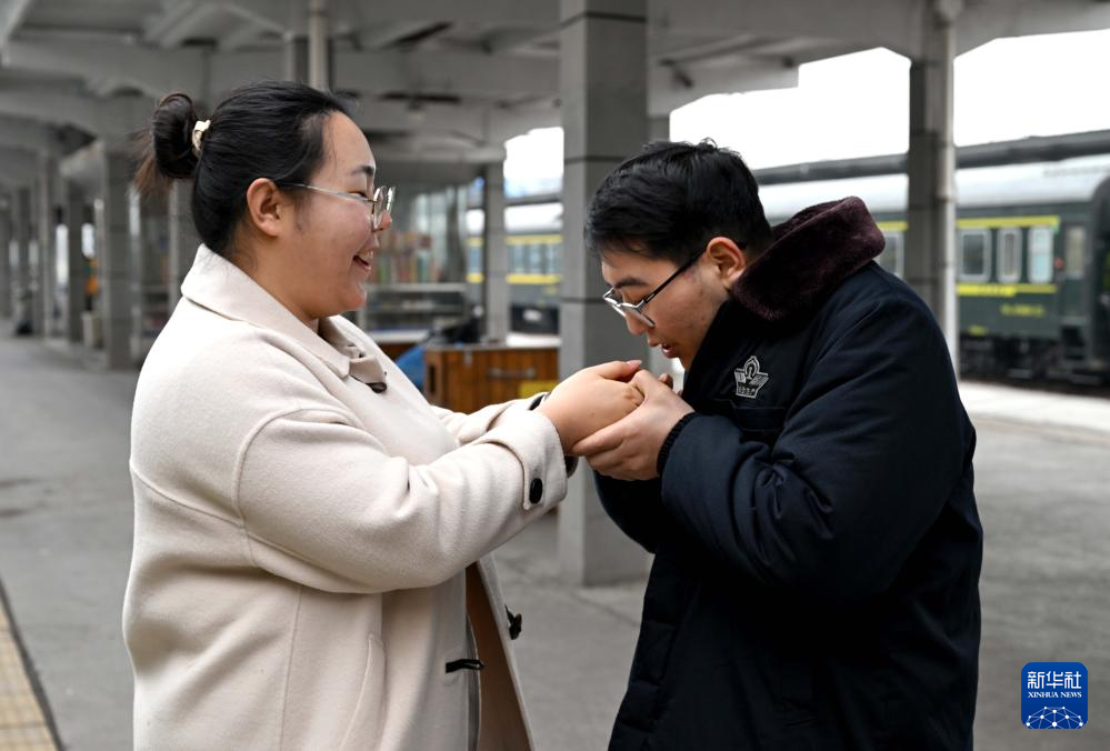 在新乡站站台上,杜永其给苏媛婷哈气暖手(2月1日摄)。