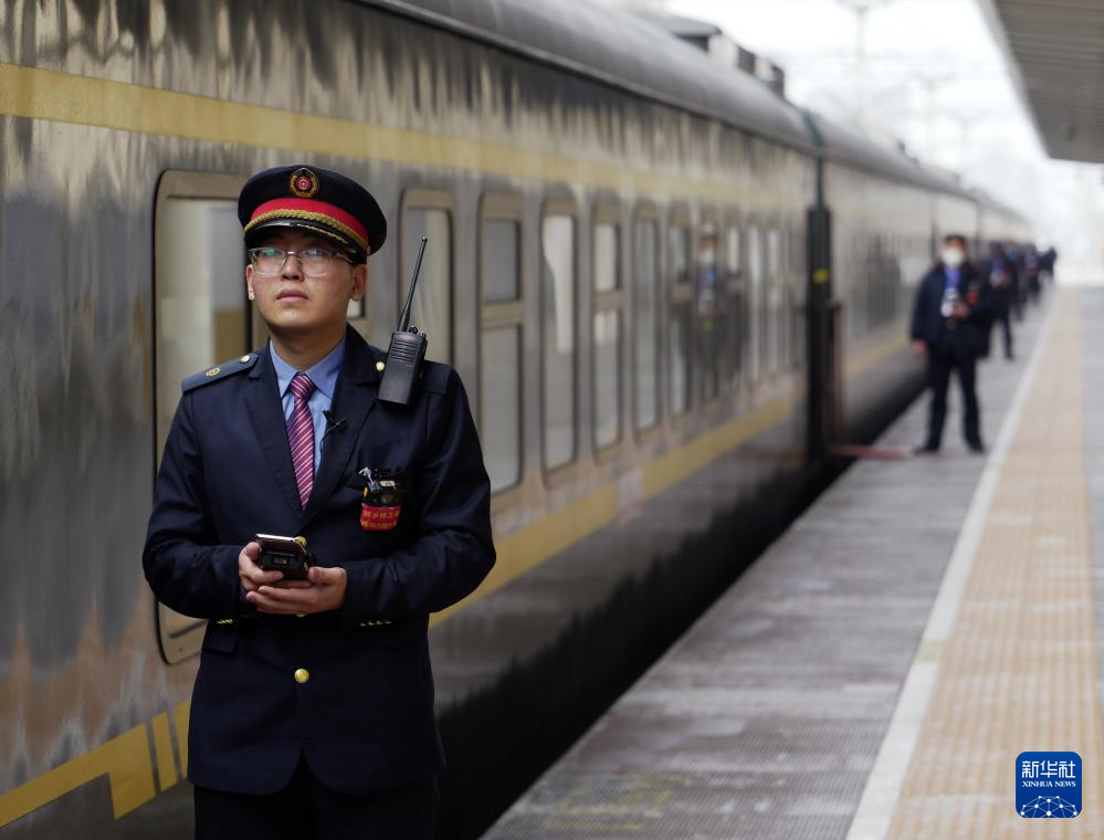 在新乡站站台上,苏媛婷在一旁悄悄观望,等候杜永其完成工作(2月1日摄)。