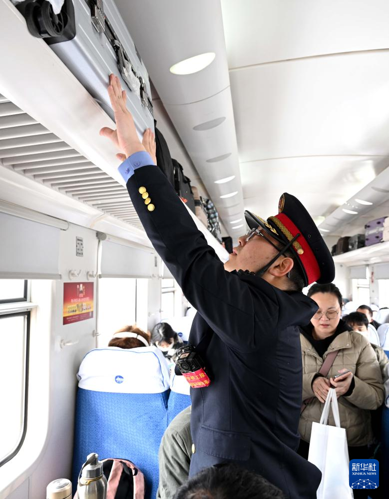 杜永其在K4081次列车车厢中帮助旅客放置行李(2月1日摄)。