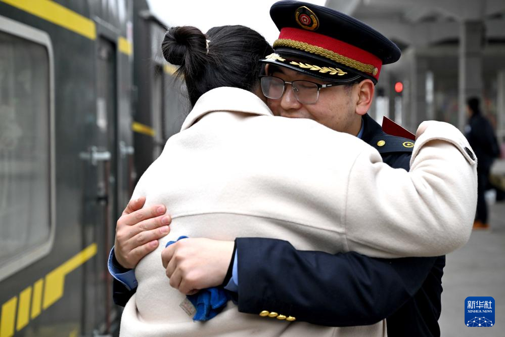 在新乡站站台上,突然现身的苏媛婷给了杜永其一个惊喜(2月1日摄)。