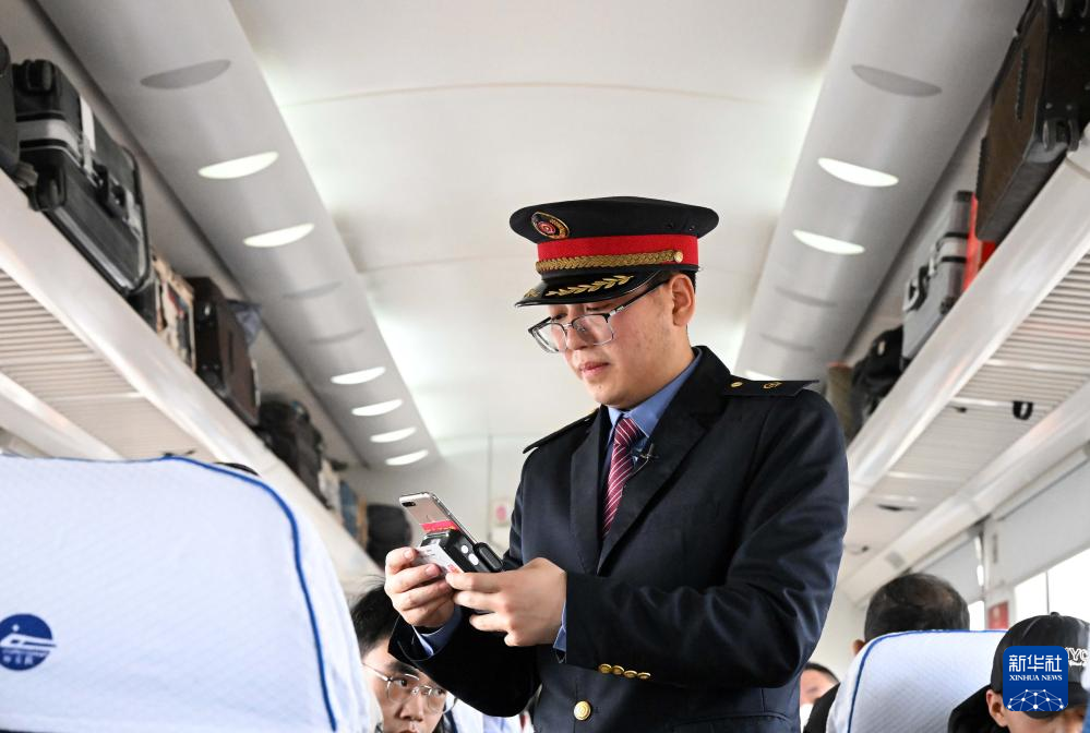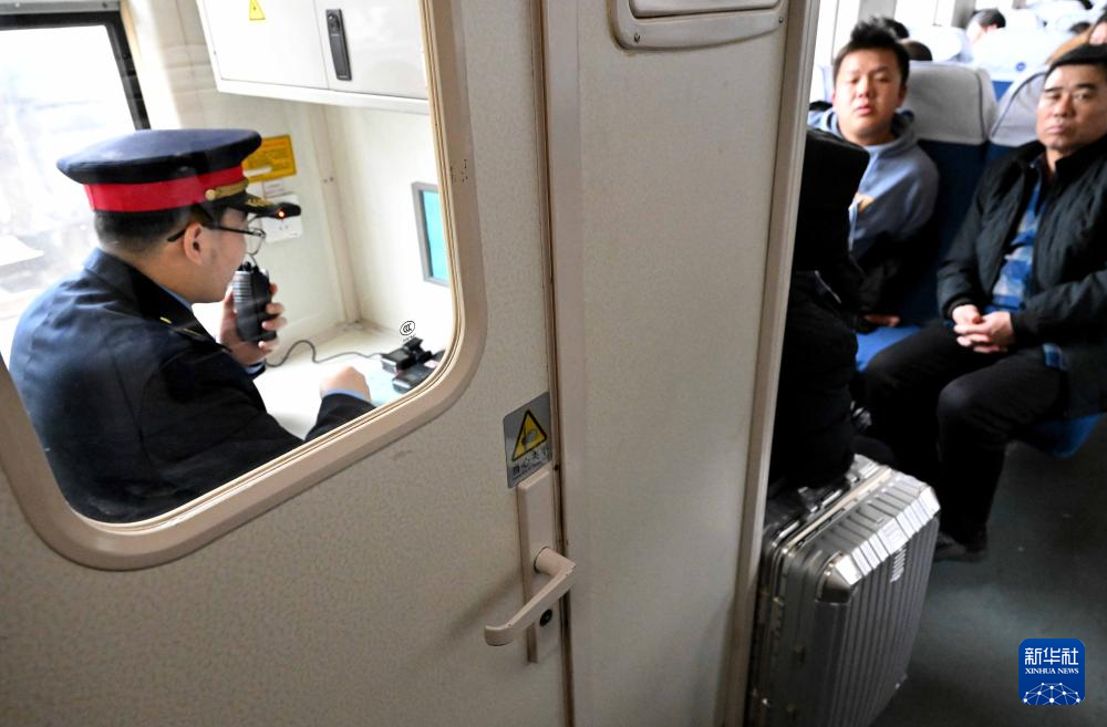 杜永其在K4081次列车车厢中为旅客验票(2月1日摄)。