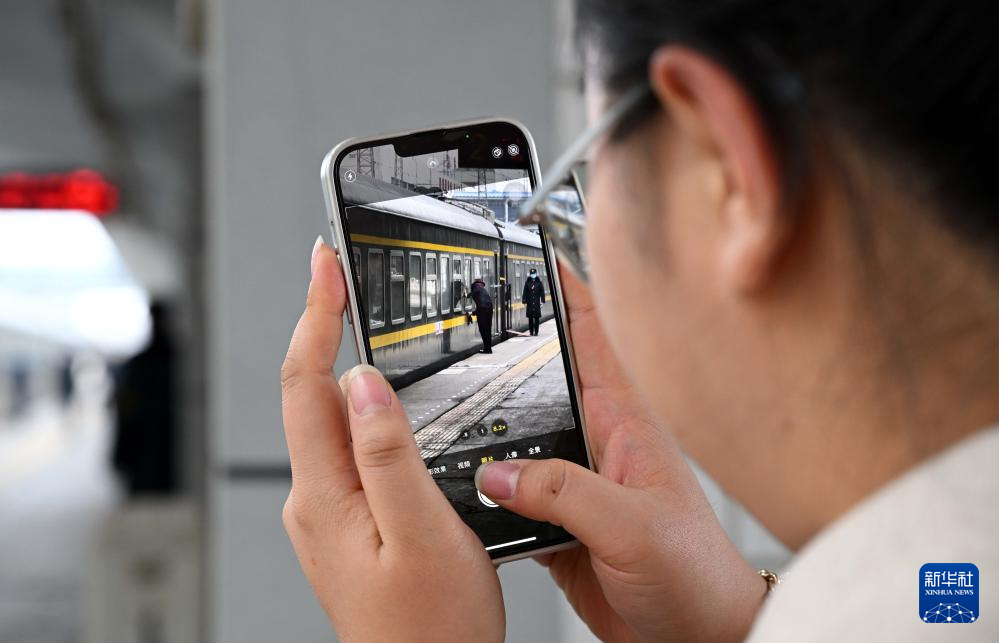 在新乡站站台上,苏媛婷在远处拍摄杜永其值乘(2月1日摄)。
