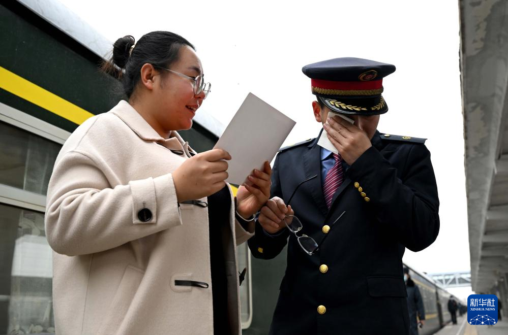 在新乡站站台上,看到带来婚书的苏媛婷,杜永其流下了泪水(2月1日摄)。