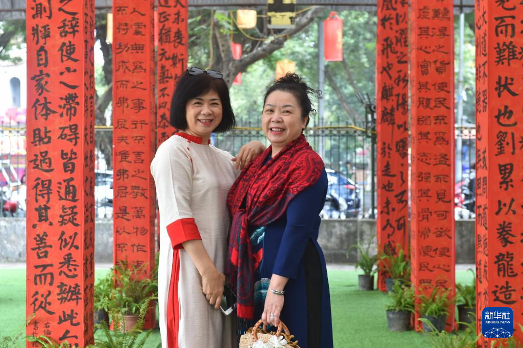 2月10日,在越南河内的文庙-国子监,两名越南女子在汉字书法作品展示区拍照。
