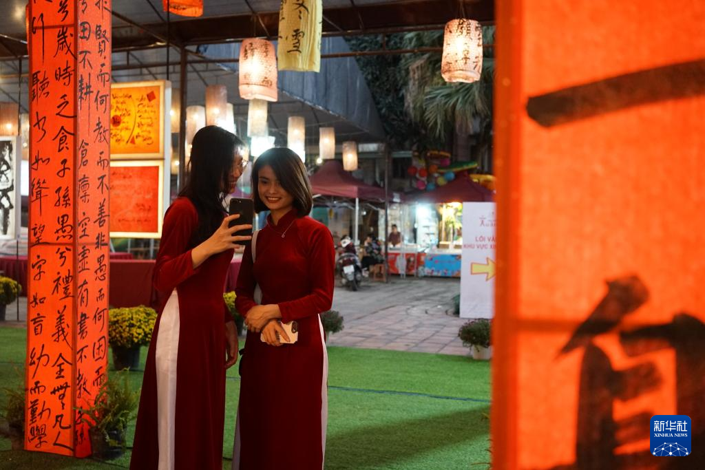 2月4日,在越南河内的文庙-国子监,两名越南女青年在汉字书法作品展示区拍照。